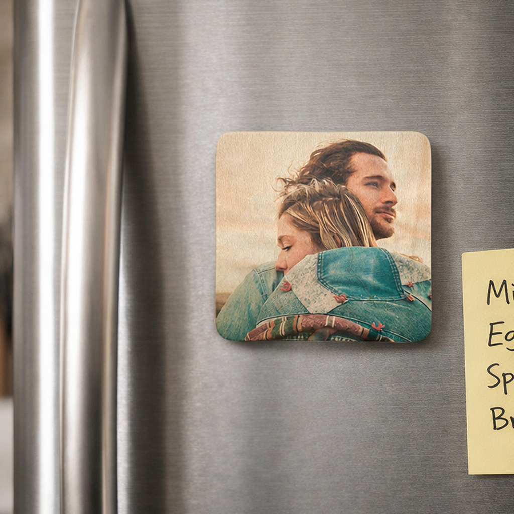 Each 2.5" x 2.5" square magnet is made from real birch wood, showcasing natural grain variations and a warm, organic texture that makes every piece one of a kind. Whether it's family photos, beloved pets, travel memories, or special milestones, these wood magnets add a personal, handcrafted touch to fridges, lockers, and workspaces.